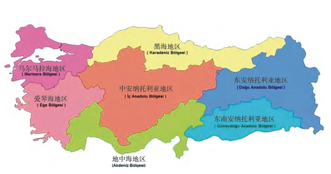土耳其由81 个省组成,划分为七大地理区域,分别为马尔拉尔海地区、爱琴海地区、地中海地区、黑海地区、中安纳托利亚地区、东安纳托利亚地区和东南安纳托利亚地区。
